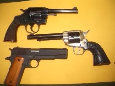 with extra mag.; Colt Official Police .38 sp., 4" barrel; Hawes .22 LR single action revolver;